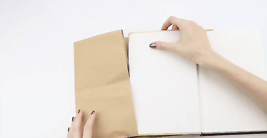 Measure the cover. Place the brown paper down on a flat work surface. Center the book on the paper. If you are using a paper bag, you will want to cut the paper bag open so that it lays flat. Remove any handles as well. Your paper should be bigger than your book so that you have enough of it to wrap around your book and create pockets for the covers to slide into.