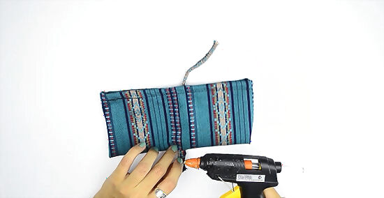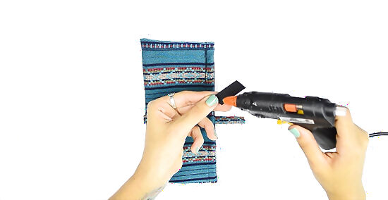 Fold over the edges. Next, fold over the edges of your pouch so that about an inch of fabric is hanging over on all sides. Take your hot glue gun and use it to secure this edge all around your pouch. This will ensure that you have a nice even seam around the top of your pencil pouch. Only glue a small area of fabric at a time and press the fabric together as you apply the hot glue. Make sure that you hold the hot glue gun close to the fabric as well, or it may dry before it reaches the fabric. You can also sew the edges together if you prefer. If you do not have hot glue, then you can use fabric glue, but you will need to leave it to dry overnight.