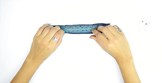 Glue or sew the edges of your strip of fabric. Next, you will need to fold over and either glue or sew the edges of your strip of fabric. Take the fabric and lay it out flat, then take one of the long sides and fold it in towards the center. Glue the underside of this piece to secure it. Then, fold over the other side of the fabric and glue the underside of this fabric as well. You can also sew the two edges of the strip together and then turn the strip inside out if you prefer. If you do not have hot glue, then you may also use fabric glue, but you will need to let the glue dry overnight. You may also want to place a heavy book over the fabric to ensure that fabric stays stuck together as the glue dries.
