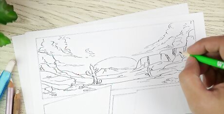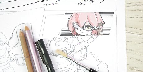 Color your characters in and compose your background textures. Once you’ve finished inking your characters, add color to make them pop off of the page. Draw your backgrounds out and use a variety of drawing techniques to compose your backgrounds. Even if your action is taking place in a city, you don’t need to draw a detailed landscape in every panel. In fact, this would result in over-crowded frames that contain too much visual information! If you’re working digitally, watercolor brushes can make abstract backgrounds pop and keep the focus on the action. If you’re hand-drawing your comics, use cross-hatching, which is a variety of perpendicular lines, to create cool abstract backgrounds. Once you’ve given the reader an establishing shot to indicate where the action is taking place, your readers will assume the characters are still in that location in the subsequent panels. You don’t need to keep reminding them with detailed backgrounds. Hand-drawn comics can be made with markers, colored pencils, or a combination of the two. It’s really up to you!