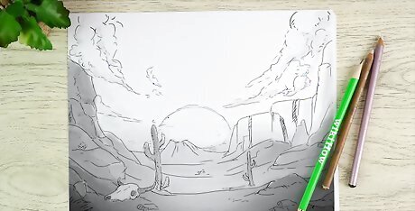 Start with an establishing shot at the beginning to reveal your setting. An establishing shot refers to an image in film or comics that shows the reader where the action is taking place. This can be a simple drawing of a city’s skyline or a detailed depiction of a clearing in the woods. Make your first 1-3 images drawings of your setting so that readers know where the action is taking place.Tip: You may notice that comics usually start with 1-2 bigger panels showing the environment. This is a good way to hook your reader and give them a clear first impression of the setting’s attitude, style, and look. Use a separate establishing shot for each new location. It’s normal for a single comic to take place in 4-5 different locations. A common technique is to “zoom in” on the action. For example, you might start by drawing a city’s skyline in the first panel. The second panel could depict the street where the story takes place. The third panel might show a single window where we see the character sitting down at a desk. This is a good way to establish where your character is without using written words.