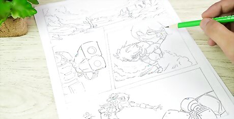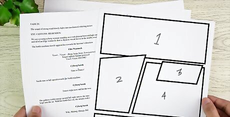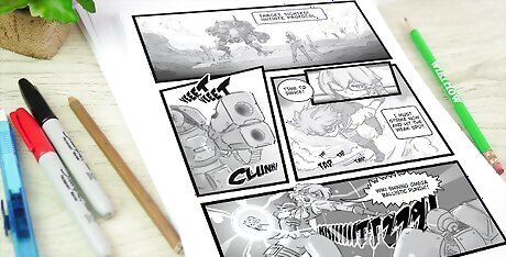 Determine how many panels you’re going to need to depict your action. First, take a red pencil and read through your script. Draw a line at each point where you think you want to start a new page based on how fast you want your story to progress or how many lines of dialogue you’ve passed (16-20 lines of dialogue is usually the maximum for a page). Once you have your pages separated, use a different color pencil to split your pages up into distinct panels. For particularly momentous or emotional moments, consider giving the moment a larger panel, or even its own page.Tip: You must have an even number of pages unless you want to put a credits page at the end. You can also put a page filled with publication information at the front. If you have an odd number of pages, you’ll end up with a blank page that may confuse your reader. More than 6-8 panels on a single page is going to be too much for most readers to process. More than 3 speech bubbles in a single panel is going to be too much dialogue to fit in one illustration. An individual page usually has 1-3 key actions take place. These actions could be a piece of important dialogue, a character going from one location to another, or a character interacting with another character. Avoid overloading your pages with too many events to give your readers time to process what’s happening. You can always revise the order of your panels or number of pages. Don’t worry about it if you change your mind when you’re proofreading!