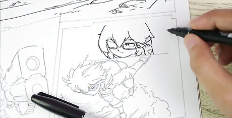 Sketch out your panels in pencil to get a rough idea for the action. If you’re working on paper, jumping right to pen and ink can be disastrous. Start by drawing tentative outlines for your characters and action with a pencil. You can add backgrounds later, so focus on framing your characters in each panel. Use a variety of compositions to keep the visual information fresh and interesting on each page. For example, you can draw the character’s face close up in one panel, filling the entire panel. In the next panel, you can draw them standing on the left side of the panel, leaving plenty of room for background information. Don’t draw your characters floating in the middle of every panel to keep things fresh. Pay attention to how characters are framed differently in movie shots. You’ll notice that characters aren’t always filmed right in the middle of the screen. Comics take a lot of visual cues from movies, so use film shots as inspiration for your images. In order to focus on composition first, draw your rough sketches out before you start inking or adding details. You can use a simple style and make your characters basic if you want to emphasize the story and can’t draw well! There’s no rule that says comic books have to be extremely detailed.