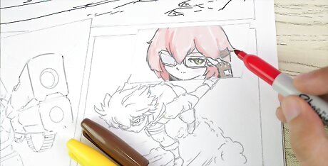 Add detail and ink your characters, leaving space for the speech bubbles. Once you’ve got the layout finished and you’ve sketched what’s happening in each panel, start adding details. Use your pencil or tablet to sketch out more visual information and erase or remove guide lines before inking your characters in black ink lines. Add your textures, facial features, and key details to give your images some definition. Add detail to all of your panels in chronological order if you want a consistent drawing style. If you aren’t worried about it though, you can certainly ink and color your panels individually.