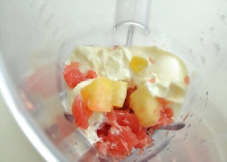 Put the grapefruit, juice, pineapple, yogurt, oil, and ginger into a blender. Put the segments with the juice into the blender and add 2 cups (490 g) of frozen pineapple chunks, 1/3 cup (94 g) of Greek yogurt, 1 tablespoon (15 ml) of coconut oil, and a 1/4 inch (6 mm) knob of peeled fresh ginger. If you don't have Greek yogurt, you can use any type of yogurt you have on hand. Keep in mind that if you use a low-fat or non-fat yogurt, the smoothie won't be as thick and creamy.