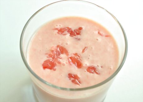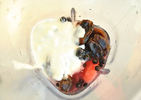 Place the grapefruit, juice, yogurt, berries, and dates into a blender. Put the grapefruit segments with their juice into the blender and pour in ⁄4 cup (59 ml) of pomegranate juice. Add ¼ cup (71 g) of Greek yogurt, 2 cups (200 g) of blueberries or blackberries, and 5 chopped Medjool dates. If you prefer, substitute your favorite type of yogurt. If you don't have Medjool dates, use figs, raisins, or prunes instead.