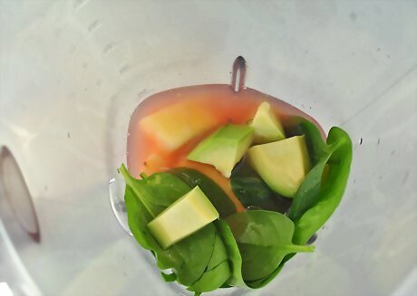 Put the pineapple, avocado, and spinach into the blender. Add 4 cups (900 g) of fresh pineapple chunks along with 1/2 of a peeled avocado, and 4 cups (900 g) of baby spinach. If you can't get fresh pineapple, used canned pineapple, but drain it first. The avocado will make the smoothie taste creamy.