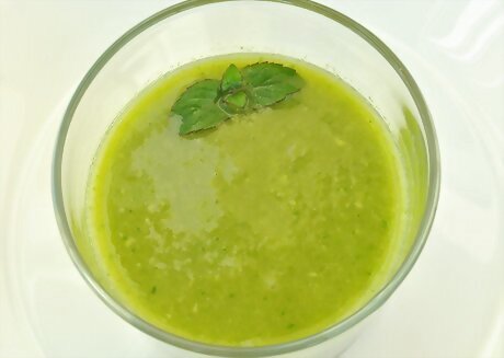 Pour the smoothies into glasses and garnish them. Remove the lid and divide the smoothie between 2 serving glasses. To garnish the smoothies, sprinkle 1½ tablespoons (21 g) of chia seeds over them and top each with a sprig of fresh mint. The chia seeds will add a slight crunch to the smoothies. Leave them out if you prefer. Store leftover smoothie in an airtight container and refrigerate it for up to 24 hours.