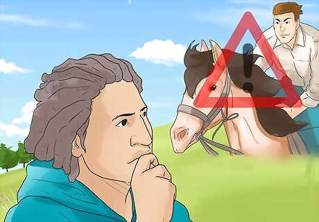 Determine the cause of the rear. Once your horse is calm and the situation has been defused, you'll need to figure out why your horse reared up in the first place. The first thing you should consider is whether something scared your horse on the trail or in the field. Look around your immediate area for anything your horse might have been frightened by. Remember that your horse may have been frightened by something other than an animal. If your horse has never crossed a creek before, for example, it could be frightened of the water. If there is nothing in your surroundings that could have caused the rear, your horse was most likely either uncomfortable (perhaps with the bit you've used, or the way you're riding).