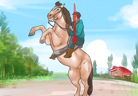 Loosen the reins. If your horse starts to rear, the first thing you should do is loosen the reins. This may seem counterintuitive, as your gut reaction will probably be to pull, but this will only make things worse. Continue to maintain your grip on the reins. In other words, don't just let go or loosen your grip. Push your hands towards the horse's mouth while holding firmly onto the reins to loosen them up. Never pull back when the horse starts to rear. This may cause the horse to rear further, potentially flipping the horse over on top of you.