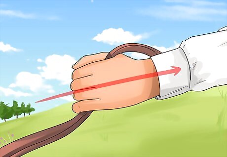 Prevent a repeat rear. Now that you've pulled your horse out of a rear and assessed its attitude, you'll need to take precautions to prevent another rear. If you feel that your horse might repeat another rear, you may not be able to fully prevent it, but you can reduce the horse's ability to rear up. This will eventually calm the horse down until it is more stable and willing to ride or walk back to the stable. Tighten your grip on one of the reins (but not both). Pull that rein out to the side as far as you can go, and with as much strength as you can. This will lead the horse into a half-circle or a turn. Keep that rein off to the side until the horse is fully calmed down and no longer threatening to rear. If the horse attempts to rear again at this point, it will be significantly less powerful and less effective. The horse will be forced to move horizontally, and even if it tries to rear it won't put you in nearly as much danger.