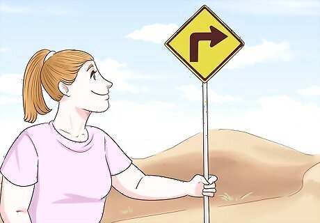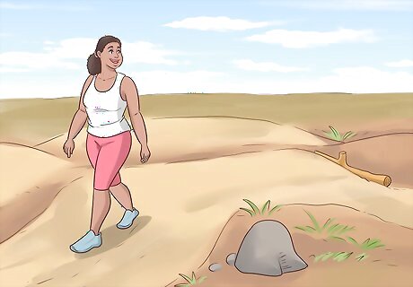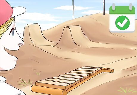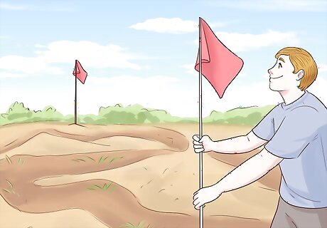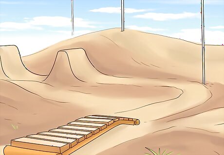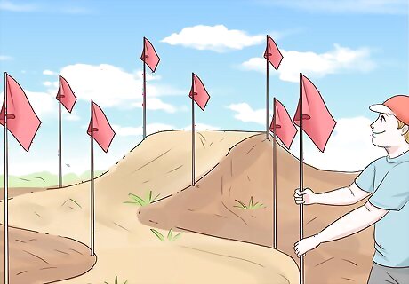 Include obstacles in your course to increase difficulty. Use the excess ground you removed earlier to build dirt jumps along the course, or add in some wooden ramps. Use the built-in features of the terrain before adding artificial obstacles. Natural obstacles are generally best, and there are usually plenty of trees, large rocks, and bushes that you can wind around for more of a challenge. To build a dirt jump, use the ground you collected while digging the tread. Pile the dirt to the desired height, and use a hose to dampen the top layer of the dirt. Use a flathead shovel or rake to pack the dirt down as tightly as possible so your front wheel doesn’t spin out on loose dirt. Keep jumps between 1–3 feet (0.30–0.91 m) off the ground, as any higher could be dangerous. Some other examples of common obstacles are boulders and logs that you can place in the path of your course.
