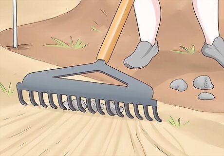 Clear shrubbery, rocks, branches, and other debris out of the path. Walk back over the area you just marked with pin flags and remove all sharp, pointed, or loose stones in the path. Use a rake to clear away small rocks, branches, or foliage. Either throw the collected debris outside of the boundary markers, or load it into a wheelbarrow to dump away from the path later on. Clearing debris ahead of time will make it easier to break up the ground later.
