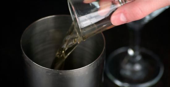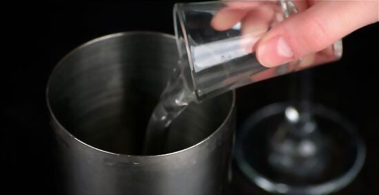 Pour the apricot liquor into the cocktail shaker.