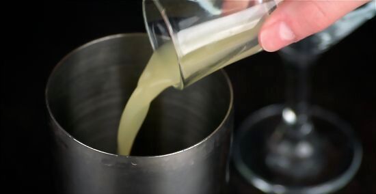 Pour the lemon juice into the cocktail shaker.
