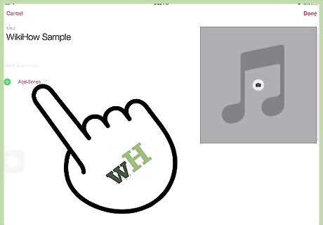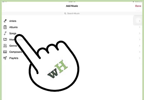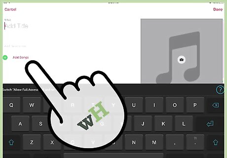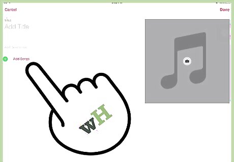 Add songs to your playlist. Tap Add Songs to bring up a menu that will allow you to pick from a variety of categories. You can choose from artists, albums, songs, genres, composers, compilations, and other playlists. When you've found the song you want to add, tap + next to the song. Once you've added everything you want to your playlist, tap Done in the top right corner. You don't have to be in Playlists to add a song to your playlist. If you find a song you want to add to your playlist from elsewhere in the Music app, tap the "More" button (•••) next to the song. Select Add to Playlist from the pop-up menu, and then select the playlist you'd like to add the song to.