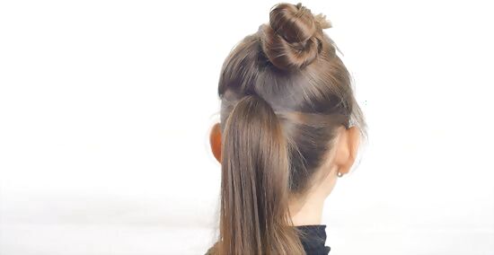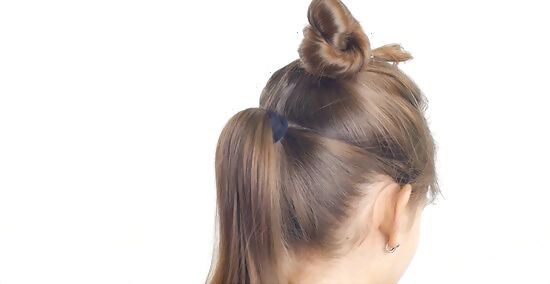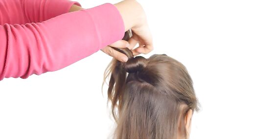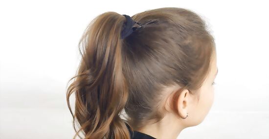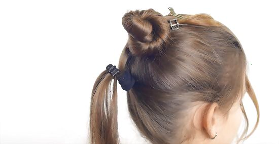 Add a mini claw clip. Do a basic ponytail and secure it with a hair tie. Split it in half horizontally. Close a mini claw clip over the base of the bottom section, then drape the upper section back on top. Be sure to use claw clip close to your own hair color.
