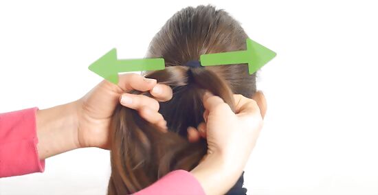 Pull your ponytail apart for instant volume. Split your ponytail in half so that you have a left side and a right side. Gently tug on both sides at the same time until you feel the hair tie scoot closer to your head. Let go of your ponytail and check it out. If you need more volume, repeat the process, but split it horizontally so that you have a top and bottom section.