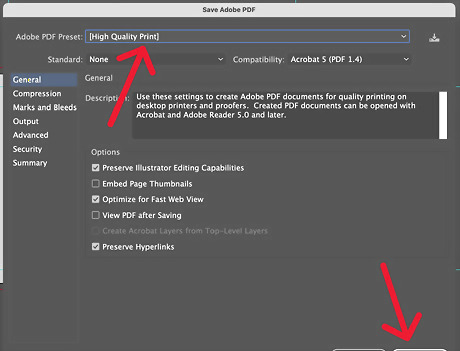 Click "Save". If the format is "Adobe PDF", this prompt opens, make sure that the preset is "High Quality Print". Once that is done, you can then click "Save PDF".