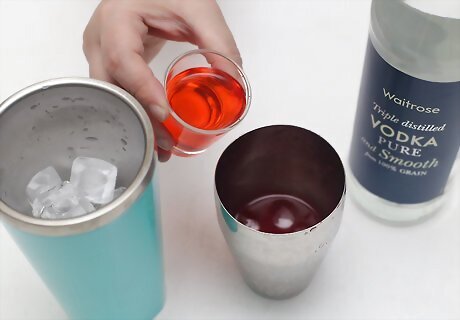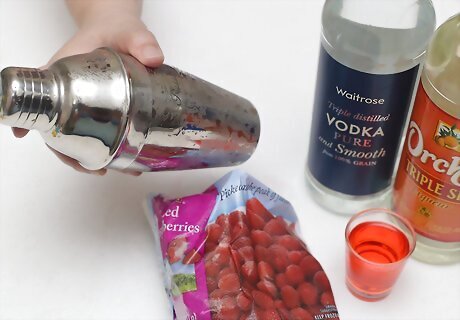 Mix in the raspberry vodka, sweet vermouth, and ice, and shake. After you've muddled the berries, pour 1 ½ ounces (45 ml) of raspberry infused vodka and ½ ounce (15 ml) of sweet vermouth into the cocktail shaker. Next, add enough ice to fill the shaker, and shake the mixture together so all of the ingredients are fully combined. It helps to store your vodka in the freezer so it will be chilled when you add it to the cocktail shaker.