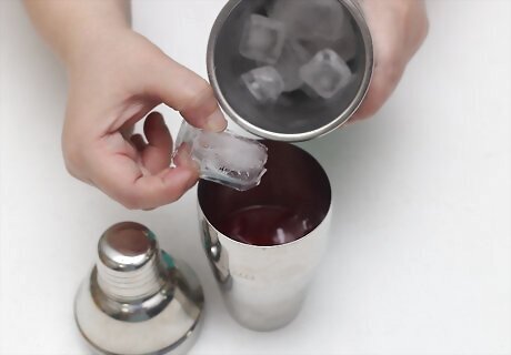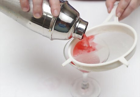 Add the vodka, lemon juice, and ice, and mix well. Once you've muddled the raspberries and grenadine together, pour 1 ounce (30 ml) of good quality vodka and 1 teaspoon (5 ml) of fresh lemon juice into the shaker. Add enough ice to fill the shaker, put the lid on it, and shake well to combine all of the ingredients. You'll know that you're finished shaking the martini when the outside of the shaker becomes frosty. When you're shaking the martini mixture together, make sure to keep your hands on the top and bottom of the shaker and not on the exterior itself. That will help keep the martini cold.