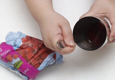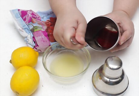 Muddle the raspberries with the lemon juice. Place three organic raspberries in a cocktail shaker with the juice from half of a fresh lemon. Use a muddler to smash the fruit and liquid together until the berries are completely crushed. You can substitute a thick wooden spoon or wooden meat tenderizer if you don't have a muddler.