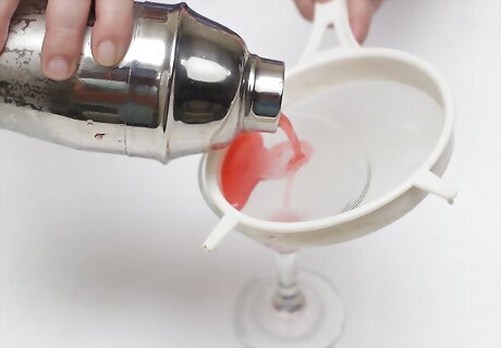 Strain the martini into a glass. Once the martini is fully combined, place a cocktail strainer over the top of the shaker and strain the martini into a chilled glass. Make sure not to allow any of the ice cubes into the glass. Chill your martini glass in the freezer for a half hour to keep your martini cold.