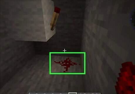 Place redstone just below the redstone torch. Place redstone on the floor just below the redstone torch you just placed. This will be used to activate the bottom piston that pushes the entrance blocks in place.