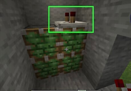 Place three solid blocks above the entrance way. One solid block should go above the entrance way blocks you just placed. Then place two blocks directly above the entrance way in a row. Place redstone dust on top of all the solid blocks. You may need to build a ladder to reach the top of the blocks or place a temporary block to stand on. The redstone dust above the entrance way is the input that activates the door. Any lever or mechanism you want to use to activate the door must be connected to the redstone blocks above the entrance way.