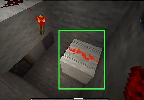 Place another solid block with redstone on top of it. This block should be placed to the right of the redstone torch you just placed and one block down (not directly under it). You should see the redstone light up when you place it on top of the block.