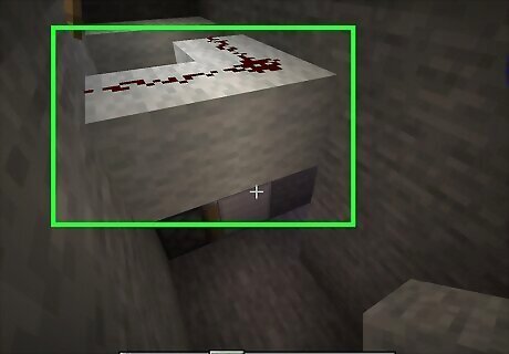 Place two solid blocks with redstone dust on top of three blocks to the right. When you enter the entrance way, turn and face right. Place two solid blocks (any solid block type) in a row, three blocks from the entrance way. Then place redstone dust on top of both blocks.