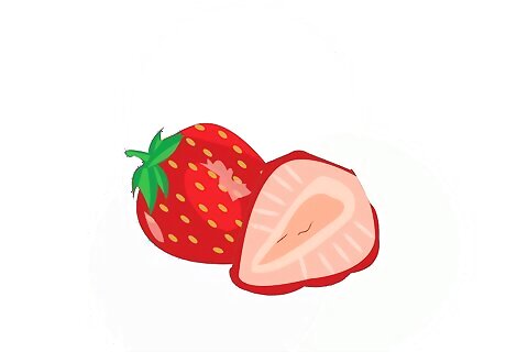 Cut up the strawberries without the stems. Do the same for all the other fruits.