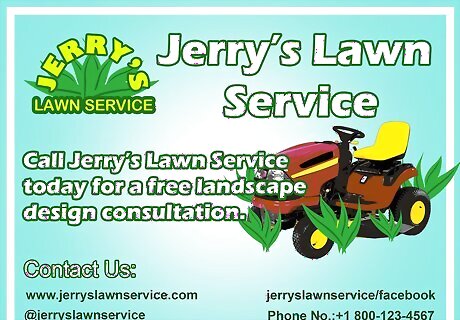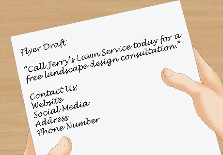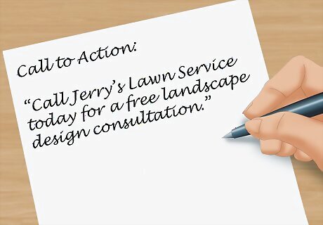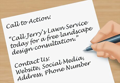 Write a call to action. A call to action makes your advertising flyer active rather than passive. It asks the person to interact with your business or service in a way that is direct. Use an imperative, direct statement. For example, write, “Call Jerry’s Lawn Service today for a free landscape design consultation.”