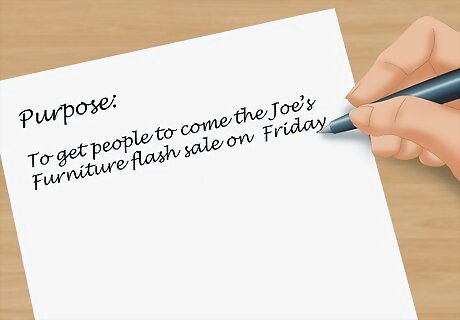 Keep the information in your flyer brief. When you’re using a flyer as an advertisement, you want it to be clear and effective. Someone should be able to walk by, glance at your flyer, and understand your main selling point or service within a few seconds. Spend time brainstorming. Write a list of the things that you want people to take away from your flyer. Narrow that down to a single phrase or a few phrases. Write down the main purpose of your flyer. For example, one purpose might be: “To get people to come the Joe’s Furniture flash sale on Friday.” This will help you clarify exactly what your flyer needs to convey. You don’t want any paragraphs or large chunks of text in your flyer.