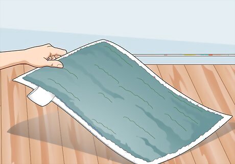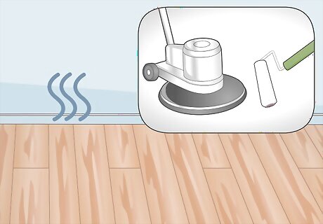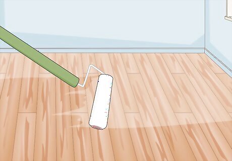 Apply a new coat of polyurethane using a long-handle roller. Dip the roller in a tray of polyurethane, rolling it back and forth so it covers all sides of the roller. Start in one corner of your room and work your way to the exit, applying the polyurethane in even, overlapping strokes. Apply the polyurethane in tight ‘W’ shapes, overlapping each swipe of the roller to ensure the entire floor is covered evenly. Keep the window open as you're working so the area is well ventilated. Feel free to use a smaller paint brush to apply the polyurethane to the edges of the floor if you're worried about the roller getting polyurethane on the baseboards or walls. Starting in the corner opposite from the exit is important so you won’t have to walk over your fresh coat of polyurethane to leave the room. Use a shed-resistant roller so nothing gets into your new top coat. Purchase a polyurethane coating for floors from your local hardware store or big box store.