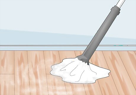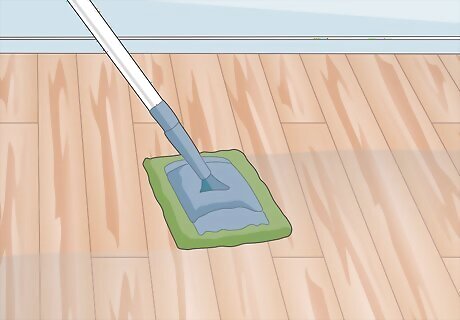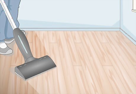 Remove dirt and dust using a vacuum or microfiber mop. To get rid of the first layer of dirt quickly, use a vacuum or mop to collect the excess dust and debris. For trickier dirt spots, dampen the mop with water and wipe up the dirt, making sure the mop isn’t too wet so it doesn't cause water damage. Using a soft-bristled broom to sweep up any dust or dirt is also okay.