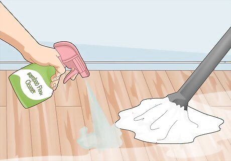 Spray the cleaner onto the floor and use a mop to spread it. Spray the cleaner onto the floor in a light layer. Move the microfiber mop along the surface of the floor, using light pressure to mop to be sure you remove all of the lingering dirt. By rubbing the bamboo floor cleaner into the floor, you'll create a beautiful shine. Try moving the mop in an S-shaped curve, going back and forth over the floor. Pay attention to the corners of rooms and any other crevices to make sure the whole floor shines. Avoid using a steam mop, as this can damage and warp the bamboo floor. Use a bamboo floor cleaner on your floors once a week or every other week, depending on how dirty they get. Keep checking on the mop head—if it comes up dirty, take it off, get a new one, and keep mopping until you've gotten the whole floor cleaned up.