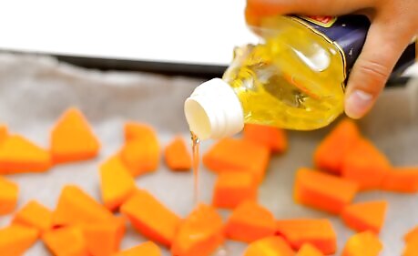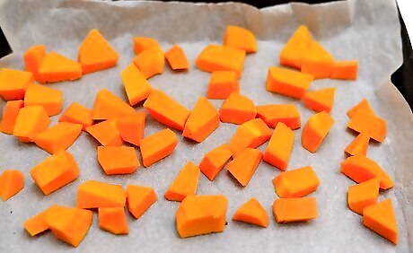 Season the butternut squash. If you're using a whole butternut squash, wash it and peel it. Cut the squash into large cubes that are about the same size. You should end up with 2 1/2 cups (350 g) of cubed butternut squash. Place the cubes in a mixing bowl and toss them together with: 3 tablespoons of olive oil 1/2 teaspoon of salt 1/2 teaspoon of black pepper 1/4 teaspoon of garlic powder