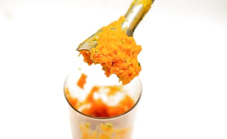 Transfer the squash and remaining ingredients to a blender. Scoop the roasted squash into a food processor or blender. Squeeze the roasted garlic out of its skin and add that as well. You should also put the remaining hummus ingredients into the processor. You'll need: 4 cloves of minced garlic 2 tablespoons (30 ml) of lemon juice 1 15-ounce (425 g) can chickpeas, lightly rinsed and drained 1/3 cup (80 g) of tahini 3 to 4 tablespoons (45-60 ml) of olive oil 1/4 teaspoon of salt 1/4 teaspoon of pepper 1/2 cup (30 g) of fresh parsley, chopped 1/4 teaspoon of ground cinnamon 1/2 teaspoon of ground cumin