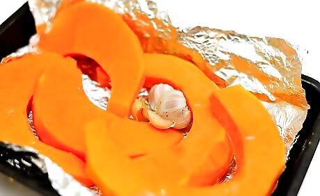 Roast the butternut squash and garlic. Preheat the oven to 400 degrees F (204 C). Place 1 cup (140 g) of cubed butternut squash and 4 cloves of whole unpeeled garlic on a baking sheet. Pour 1 tablespoon of olive oil and sprinkle a pinch of salt and pepper over the squash. Use a spoon to toss the squash and garlic evenly. Roast the squash for 15 to 20 minutes. Once the squash is tender, remove the pan from the oven and let it cool about 5 minutes or until the squash is easier to handle.