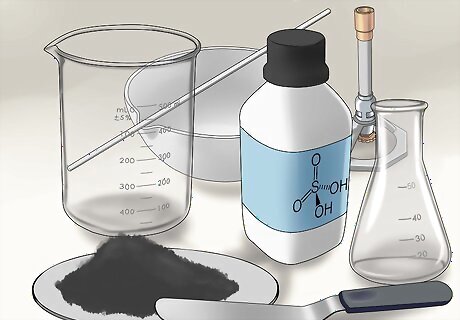 Gather all of your supplies. Place the items together in one area. Having all of the equipment you need in one place will prevent you from having to stop in the middle of a task to look for a missing item. You will need: Copper Oxide Sulphuric Acid Eye Protection Latex Gloves Glass Beaker Conical Flask Spatula Glass Stirring Rod Evaporating Dish Bunsen Burner Tripod Filter Paper Filter Funnel
