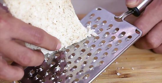 Grate the frozen slices. Grate each slice, one by one, on a metal grater. The crumbs will be visibly finer and even in texture than if you had grated the bread in room temperature. Your breadcrumbs will eventually thaw to room temperature and will have obtained its fresh taste due to it being frozen.