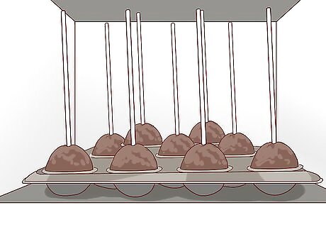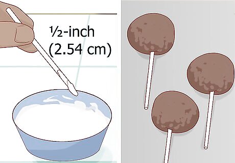 Dip a lollipop stick ½-inch (2.54-centimeter) of the way into the melted candy, then poke it into each cake ball. Be sure that you are poking the stick into the side/longer part of the oval. You can poke the lollipop sticks deeper into the cake ball if you'd like, but no more than halfway.