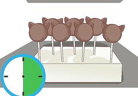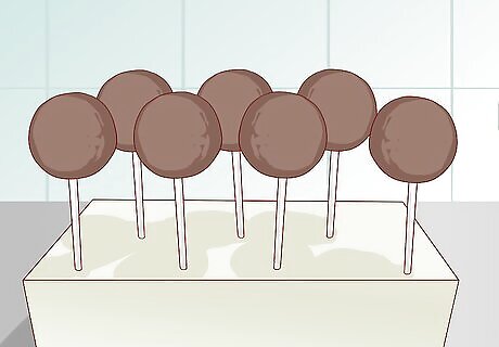 Set the cake pops down onto a Styrofoam block. Poke the lollipop sticks straight down into the Styrofoam block, so that the cake pops are standing upright. Be sure to leave some space between each cake pop.