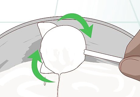 Gently tap and rotate the cake pop to coat it evenly. Hold the cake pop by the stick in one hand, and gently tap your wrist with the other. This will help get rid of any excess chocolate. Next, gently rotate the stick in between your fingers. This will help spread the melted chocolate more evenly across the cake pop. If there is too much melted candy on the lollipop stick, rotate the cake pop again, but this time, keep your finger on the lollipop stick. This will wipe off the excess candy coating.