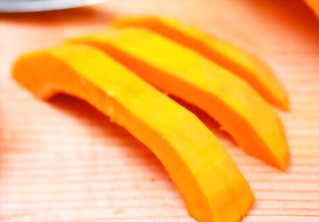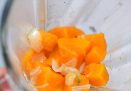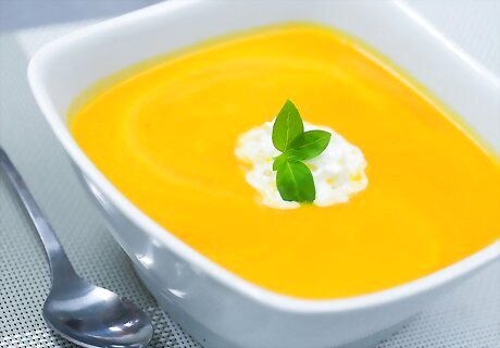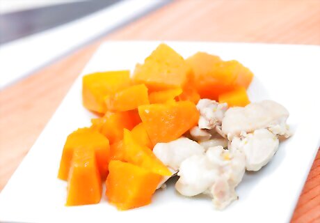 Cook the food by steaming, boiling or baking. If you're preparing a ripe fruit -- like a soft pear or avocado -- you can simply mash it up with a fork and serve immediately. Vegetables, meat and grains on the other hand, will need to be cooked first. You have several options when it comes to cooking methods: Steaming is the best option when it comes to cooking vegetables, as it preserves the most nutrients. Use a steamer basket, or simply place a colander over a boiling saucepan of water. Steam produce until it is tender, usually about 10 to 15 minutes. Boiling can be used to cook grains, vegetables and certain animal produce. You can boil the food in a broth to add more flavor, if you wish. Baking is a good option for things like sweet potatoes, cruciferous veggies, meat and poultry. You can add a little flavor to these items by adding herbs and mild spices during baking (don't be afraid to give your baby flavor!)