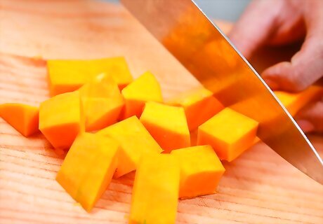 Clean and prepare the food. The next step is to prepare the food for cooking or serving -- this involves cleaning the food and removing any parts that the baby cannot chew or digest -- such as skins, pips, nuts, seeds and fat. Wash all fruits and vegetables thoroughly. Peel foods with skins and core items with seeds. Dice vegetables into similar sized cubes so they will cook evenly. In terms of quantity, 2 lbs. (900 g) of clean, diced produce will make around 2 cups (300 g) of homemade baby food. You can prepare meat and poultry by washing, removing the skin and trimming any fat before cooking. Grains like quinoa and millet should be prepared according to the instructions on the package.