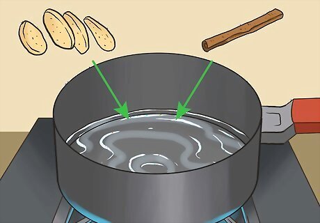 Place the ginger slices, a cinnamon stick, and 1.5 cups of water into a saucepan. Bring this to a boil over high heat. You will know when the pot is at a full boil when you have a constant stream of large bubbles coming to the surface and a good deal of steam. Once the pot has come to a full boil, reduce the heat to low.