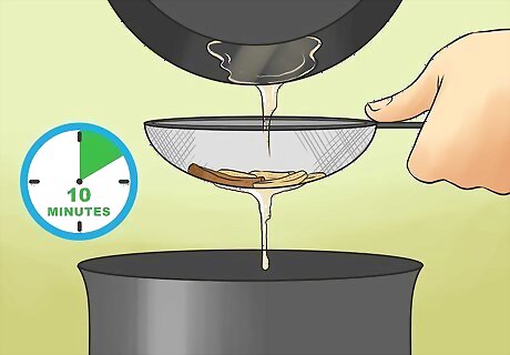 Simmer the mixture for 10 minutes. Then remove the ginger and cinnamon stick. The easiest way to remove the spices is with a strainer. Place a strainer into a clean saucepan. Pour the hot mixture through the strainer. The ginger and cinnamon will be left in the strainer and the liquid will be caught in the clean saucepan underneath.