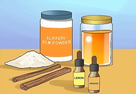 Gather your herbal ingredients. This recipe calls for slippery elm powder, cinnamon, honey, orange essential oil and lemon essential oil. You can buy slippery elm bark and the essential oils from most health food stores, herbal shops, or online herbal retailers such as Mountain Rose Herbs. Slippery elm contains a substance called mucilage. This becomes gel-like when combined with water or honey. This can help coat the mouth, throat, and digestive tract. Native Americans used this herbal remedy for centuries to calm coughs and gastrointestinal problems. Slippery elm has not been shown to cause any medical complications, unlike other herbal supplements. Little formal research has been conducted to show how effective it is at treating medical conditions. Remember that clinical studies have shown that honey is a very effective treatment for coughs. Cinnamon may also have some effectiveness at controlling a bad cough.